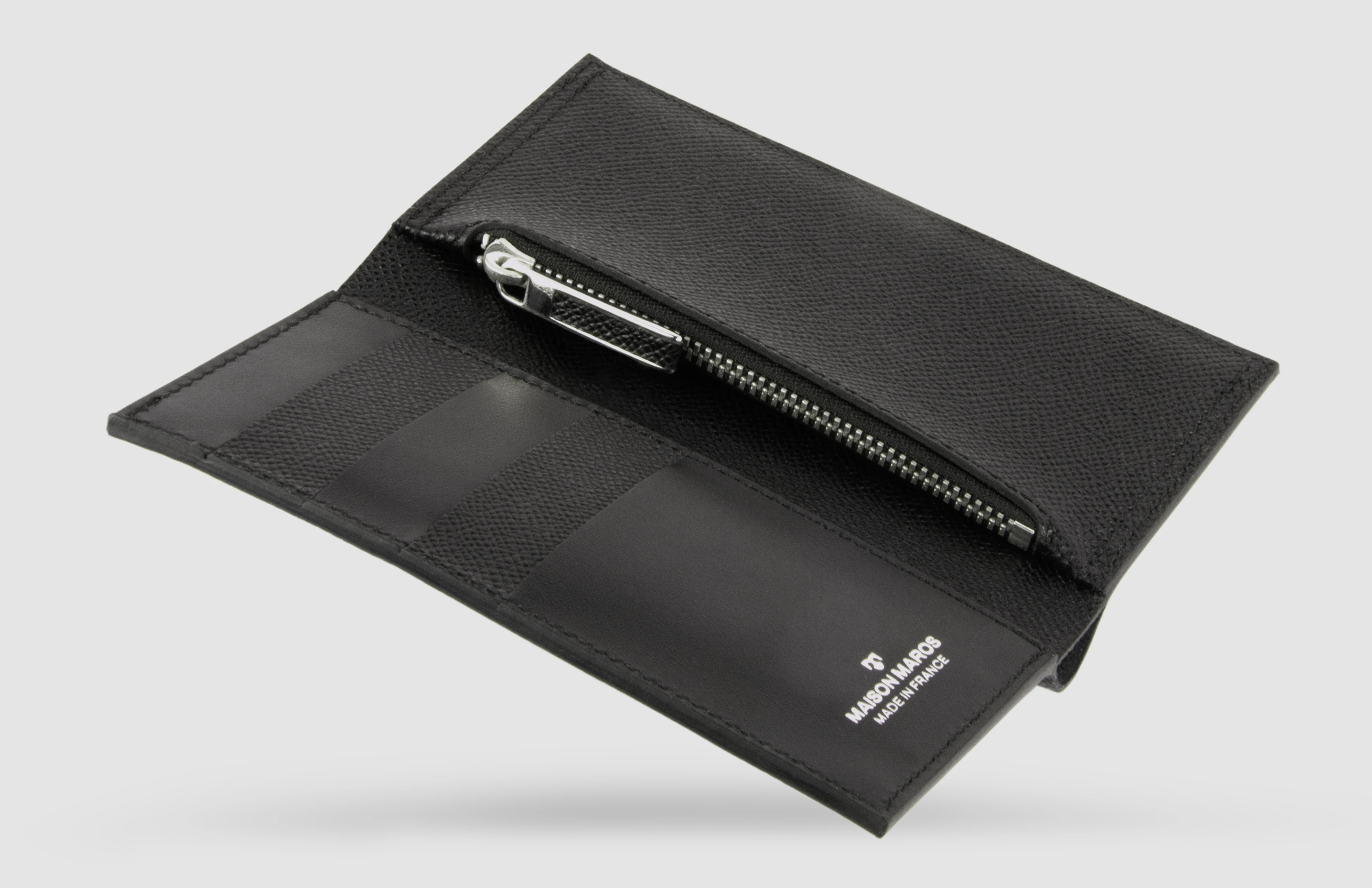 Son intérieur se compose d’un compartiment à billets, de deux grands compartiments, de quatre fentes pour cartes ainsi que d’une poche zippée pour les pièces de monnaie.