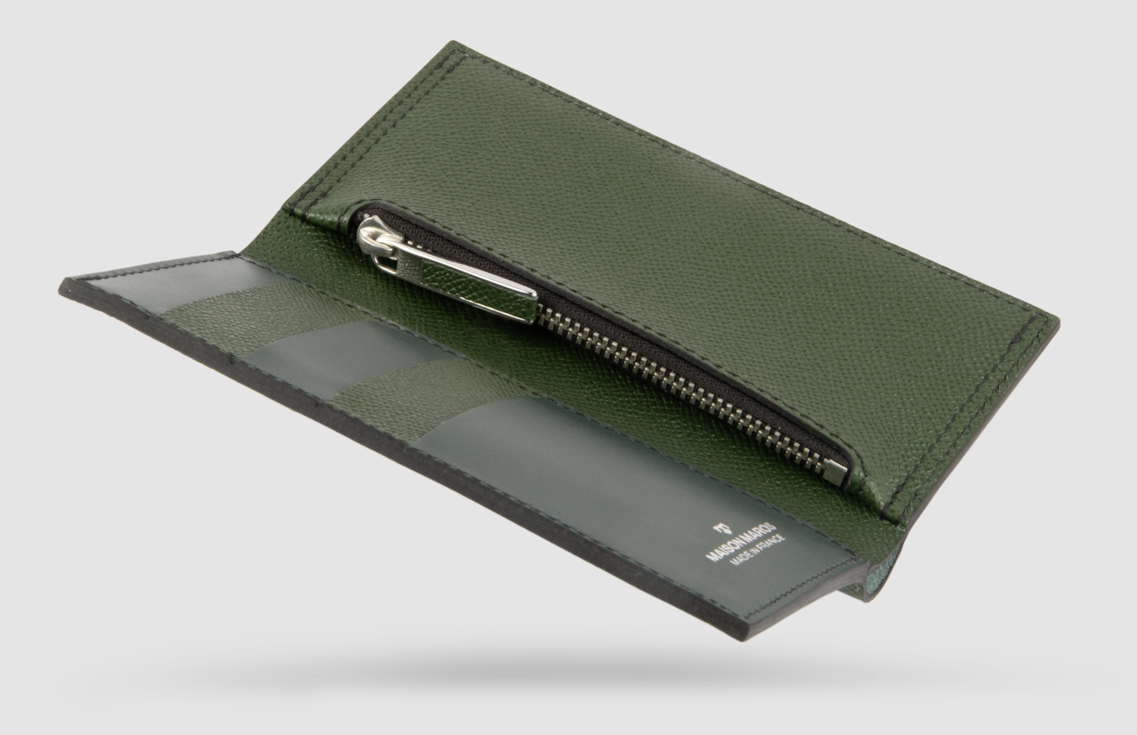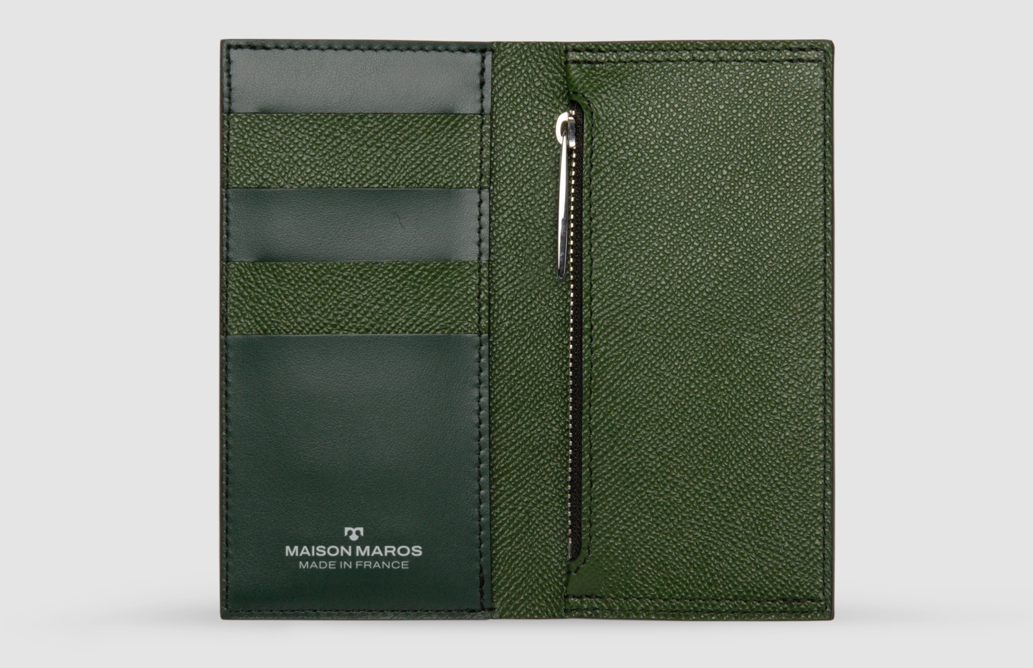 Le portefeuille Grand Estey à deux volets est confectionné en bi-matière, associant un cuir de veau grainé et un cuir de vachette lisse, pour un jeu subtil de textures et de reflets.